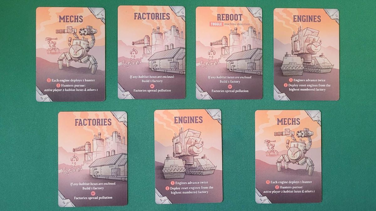 - Machine Phase: The machines take a turn after each player’s turn. Here you flip a Machine card and do what it says. The machines can build walls, spread pollution, deploy more mechs, and move mechs. When habitat hexes become fully enclosed by walls, the machines can build new factories. The more factories and pollution that spread, the harder it becomes to rewild the land and stop the machines.