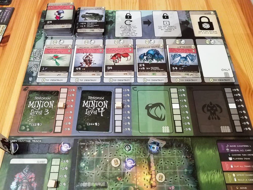 - Game Phase – All characters’ stamina tracks adjust either up or down towards zero. This is also when you draw an Enemy AI card, which will tell you how the enemies move, if idle enemies activate, and if they all get stronger. Karn moves closer to his alter on the current board every time an Enemy AI card is drawn, or he deals a Fatal Wound if he’s already on the board when the card is drawn. After the Enemy AI card is resolved, players get to choose their turn order and draw five cards from their decks.