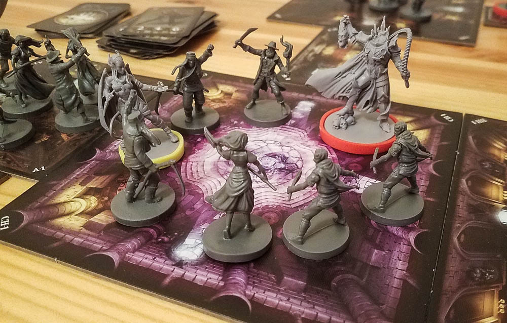Every time you kill a villager, you’ll lower village morale on the Game Overview tile. When villagers do damage to the Castle Heart, you’ll lower that dial. You’ll win if you’re able to complete a mission’s objectives and you’ll lose if the Castle Heart dial ever reaches zero.
