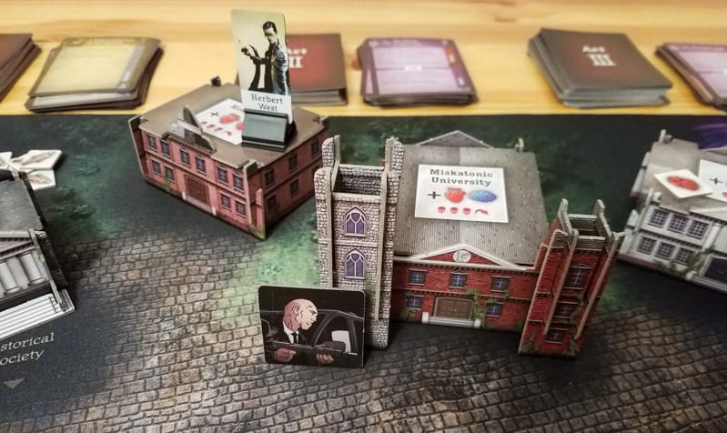 After you have read through the three Subplot cards, each player will move Herbert West to one of the eight buildings and take the action shown on top of the building. You can gain cadavers, which you will need at the end of the round when you’re attempting to perfect the serum. You’ll also want to get ingredients to make perfecting the serum easier. Tomes allow you to roll fewer dice (more on that below). And you can also regain health and sanity at multiple buildings.