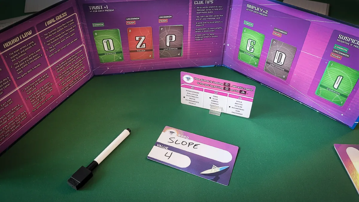 Each round, the Alien and Scientists take turns sending clue words. Every clue is scored using a hidden cipher made up of six letters. The Alien calculates the score and passes it along with the clue, giving the Scientists a chance to make deductions. By the end of the game, both sides will try to guess each other’s three words, and the Scientists will also guess the six cipher letters.