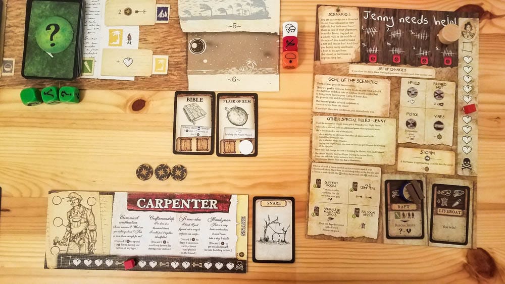 Robinson Crusoe board game review - carpenter and scenario sheet